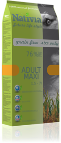 Receptura respektuje přirozené zákonitosti výživy psa. Obvyklá kombinace obilovin či brambor je zcela nahrazena pouze kvalitní rýží. Ta svojí stravitelností a profilem aminokyselin tyto tradiční suroviny převyšuje, nezatěžuje organismus a společně s ostatními komponentami výrobku zajistí zdravou výživu psa. Nativia Adult maxi obsahuje 76% bílkovin živočišného původu a řadí se tak mezi přední značky na trhu.