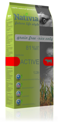 Receptura respektuje přirozené zákonitosti výživy psa. Obvyklá kombinace obilovin či brambor je zcela nahrazena pouze kvalitní rýží. Ta svojí stravitelností a profilem aminokyselin tyto tradiční suroviny převyšuje, nezatěžuje organismus a společně s ostatními komponentami výrobku zajistí zdravou výživu psa. Nativia Active obsahuje 81% bílkovin živočišného původu a řadí se tak mezi přední značky na trhu.