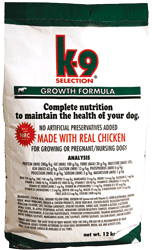 K-9 SELCTION GROWTH FORMULA je speciální kompletní výživa pro rychle rostoucí štěňata a pro březí a kojící feny. Krmivo je vyrobeno z kuřat a proto je velmi lehce stravitelné a výživné. Používá se také pro psy trpící nechutenstvím k povzbuzení jejich chutě. Velikostí granulí je přizpůsobeno snadnému krmení štěňat i malých plemen psů.