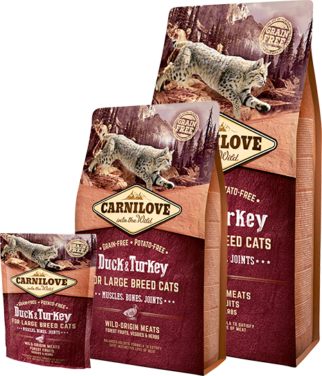 HOLISTICKÉ VYSOCE KVALITNÍ KRMIVO Z KACHNY A KROCANA BEZ OBILOVIN A BEZ BRAMBOR PRO PERFEKTNÍ KONDICI SVALŮ, KOSTÍ A KLOUBŮ VELKÝCH KOČEK (MAINE COON, AMERICAN BOBTAIL, RAGDOLL, SAVANNAH, CHAUSIE, SIBERIAN CAT, NORWEGIAN FOREST CAT, OCICAT). KOMPLETNÍ KRMIVO PRO KOČKY.