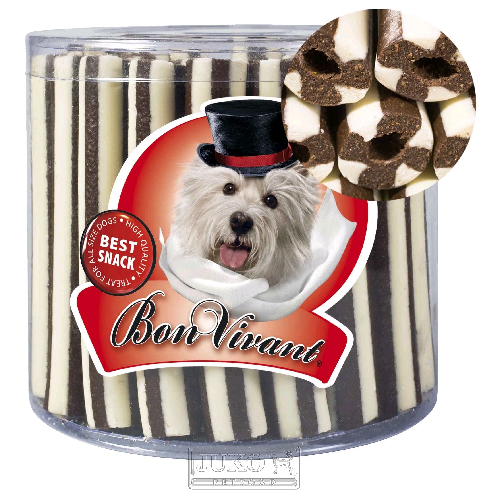 Pochoutka pro psy. Obiloviny, maso a výrobky živočišného původu, vedlejší výrobky rostlinného původu, syrovátkový derivát, oleje a tuky, minerální látky. Doplňkové látky: konzervanty, barviva, zchutňující látky. Analytické složky: hrubý protein 11,7%, hrubá vláknina 1,5%, hrubé oleje a tuky 4,5%, hrubý popel 4,9%, vlhkost 17,2%